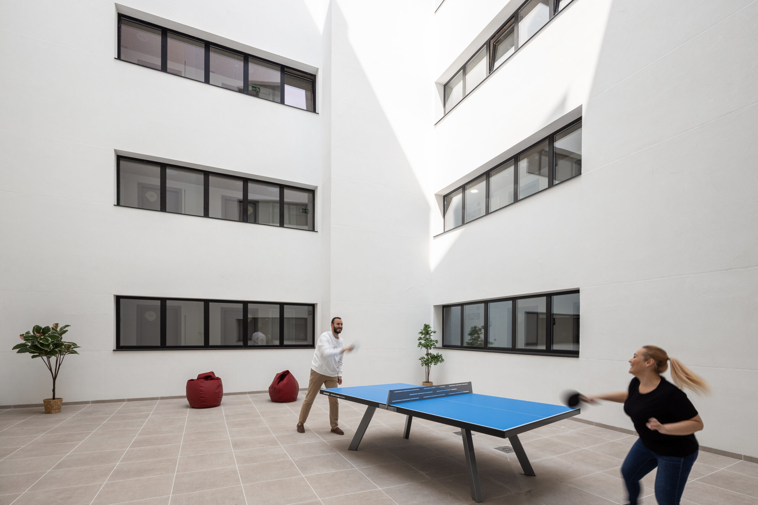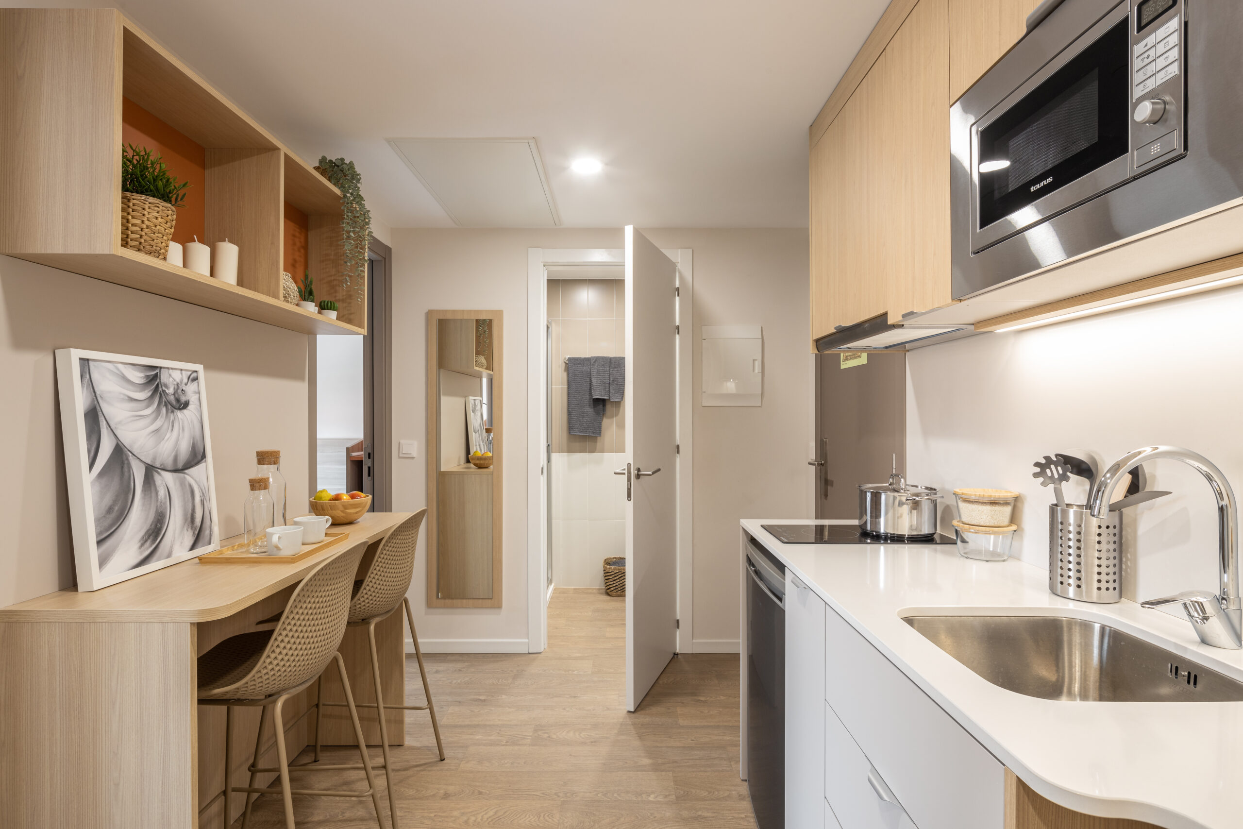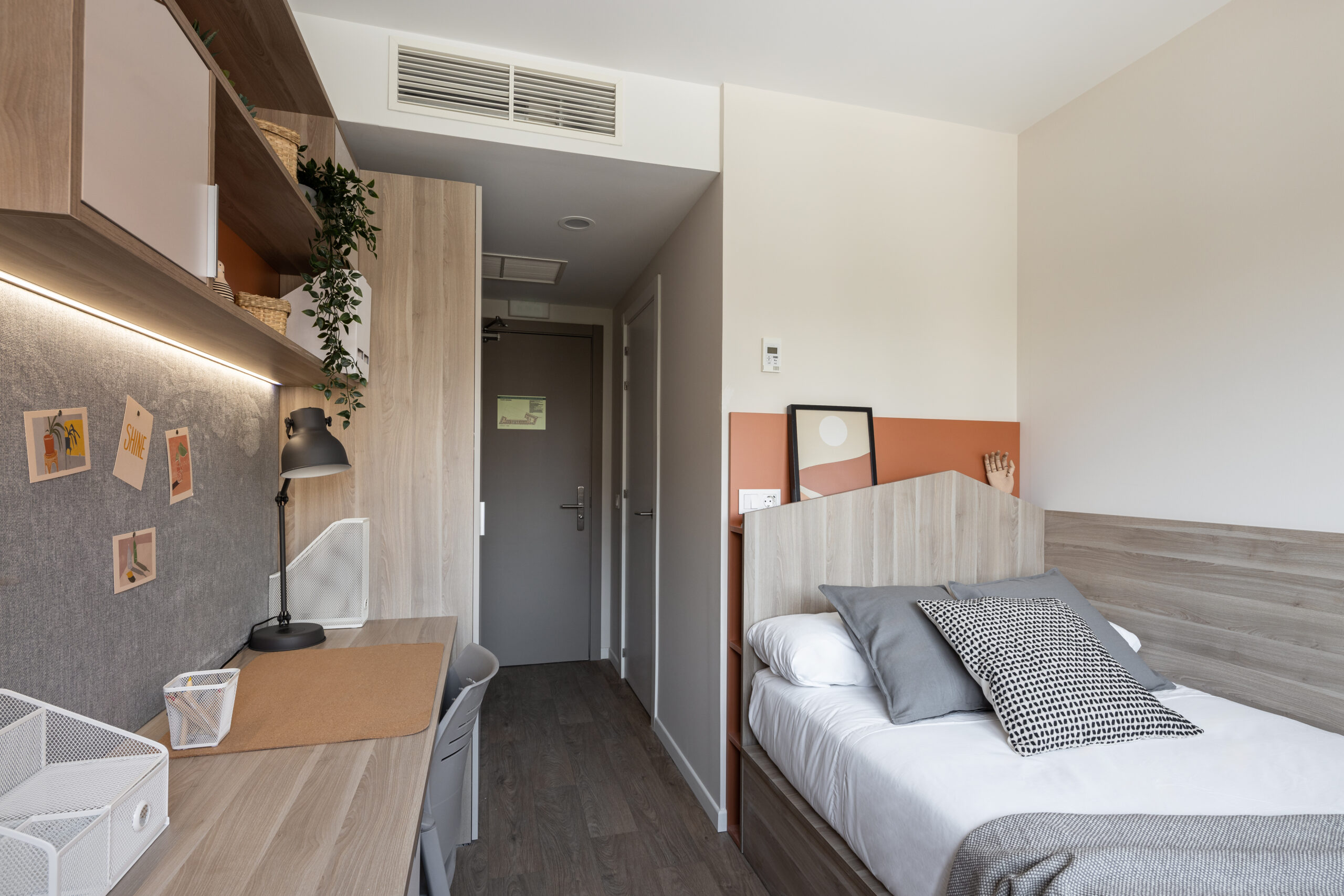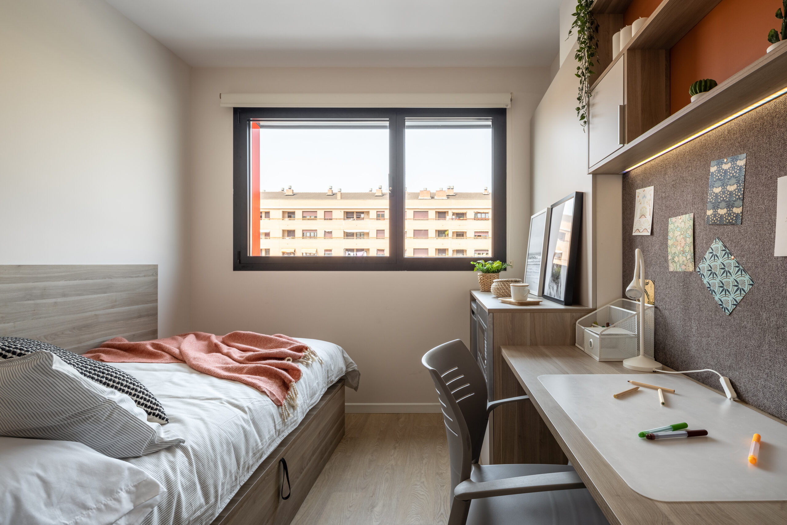 Cuenta con cómodas habitaciones, principalmente individuales, con gran ventanal en fachada, cama 1,2m, escritorio, armario y baño individual completo para hacer la estancia más agradable.