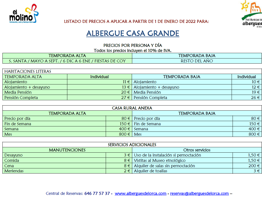 Dispone de 56 plazas en régimen de Albergue y 1 Alojamiento Rural de 8 plazas