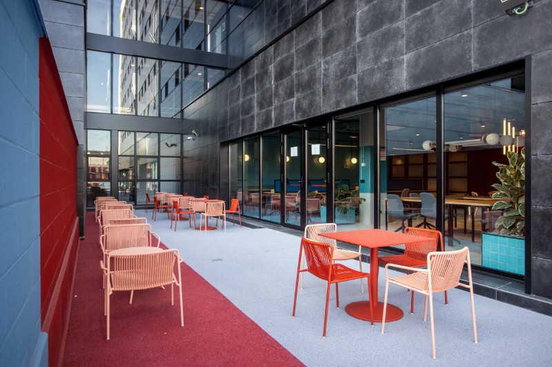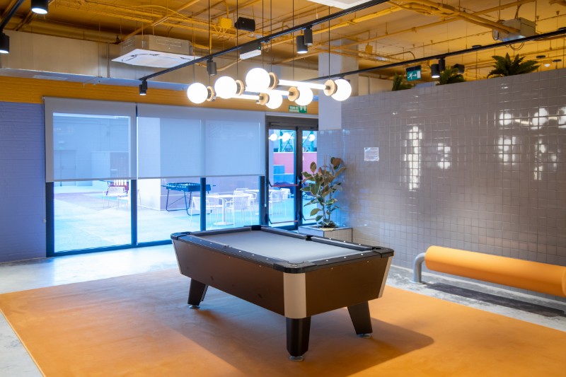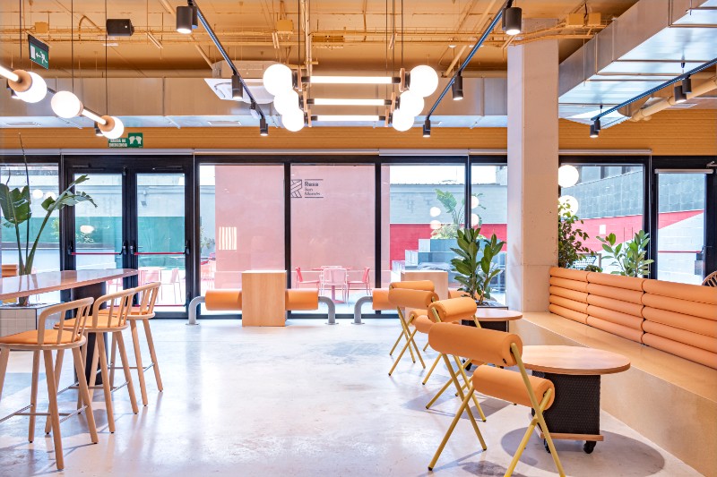 Comedor-cafetería, Lavandería autoservicio, sala fitness, sala ocio, sala TV y DVD, Salas de estudio o trabajo, terraza de 450 m2 con futbolín y ping-pong, zona relax y solárium con tumbonas.
