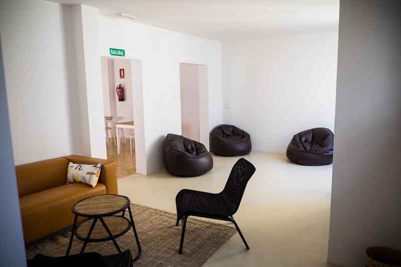 Segunda planta: Zona de ordenadores y zona Chill out con alfombra y cojines.