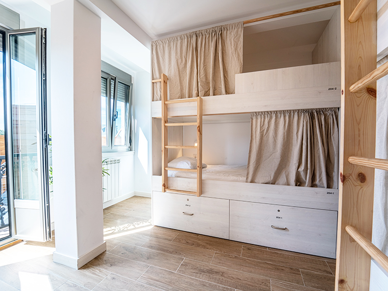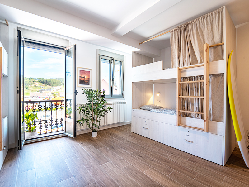 El surf-albergue tiene capacidad para 61 personas divididas en tres plantas, y cuenta con habitaciones compartidas de 6, 8 y 10 personas con una zona de duchas y baño en cada habitación así como 2 terrazas donde podrás compartir momentos únicos con tus compañeros.