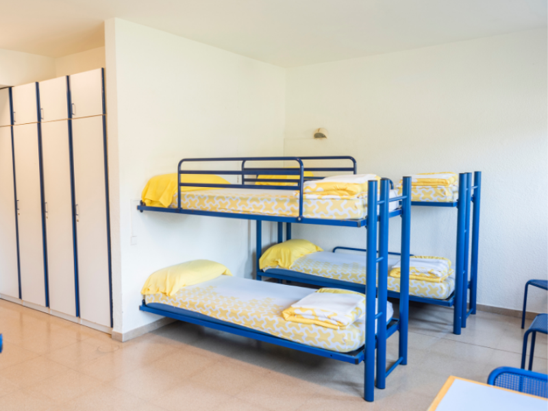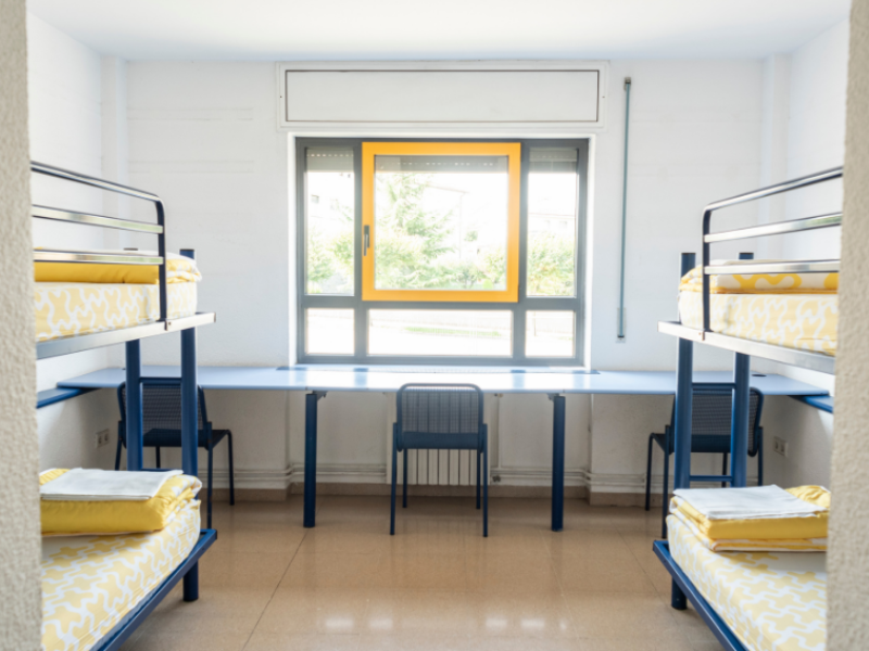 Capacidad: 165 plazas de alberguistas en habitaciones de 3 y 4 camas. Habitaciones con baño propio.
