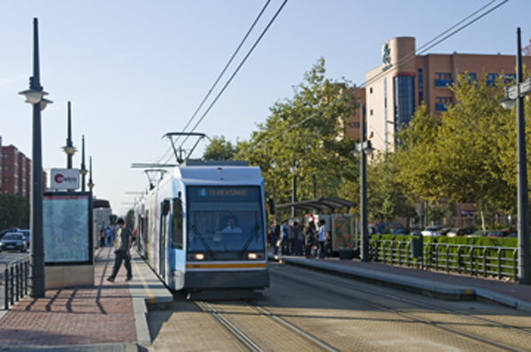 Tenemos parada en la puerta del albergue / residencia, es «Tarongers», parada de las líneas de tranvía 4 y 6 de la red de metrovalencia.