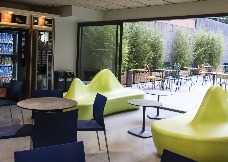 Gran terraza exterior con mesas y sillas. Salas de reuniones con pantalla y proyector. Cocina de libre uso para alberguistas. Servicio de consigna gratuita.
