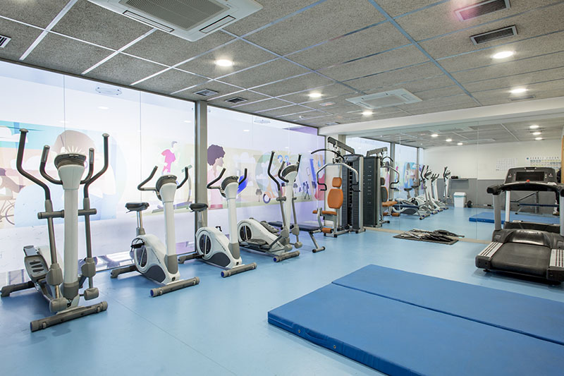 Sala de fitness equipada con bicicletas estáticas, cinta, elípticas, pesas y espalderas.