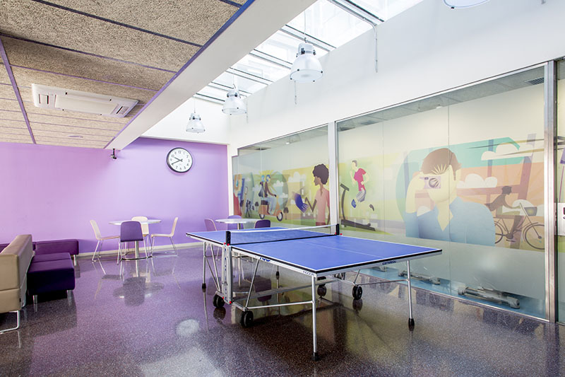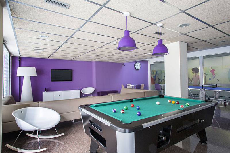 Sala de ocio con TV, Wii, billar , mesa ping-pong, sofás y mesas bajas.
