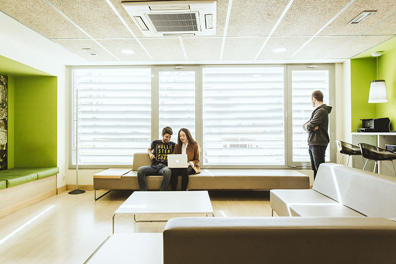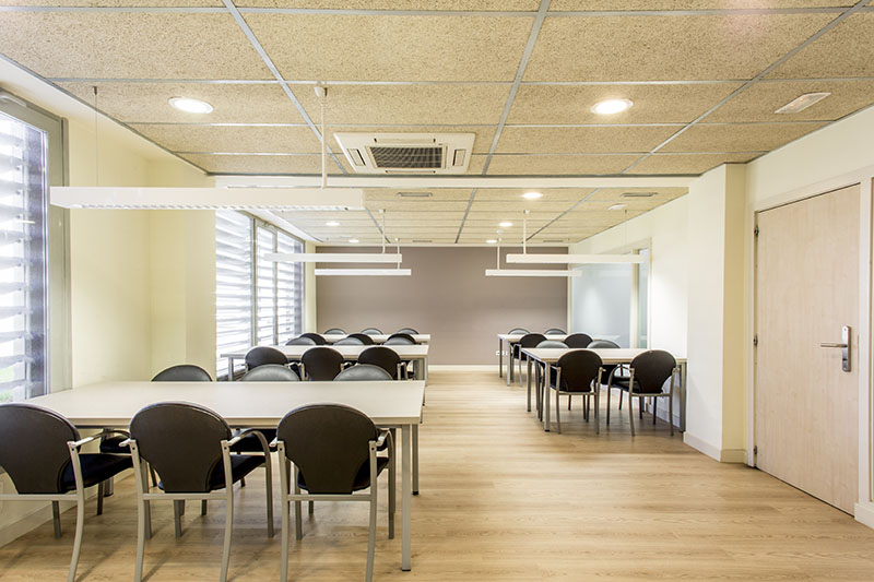 Zona de reunión-office equipada con mesas, sillas y barra equipada con fregadero, horno y microondas para poder comer y cocinar en grupo.