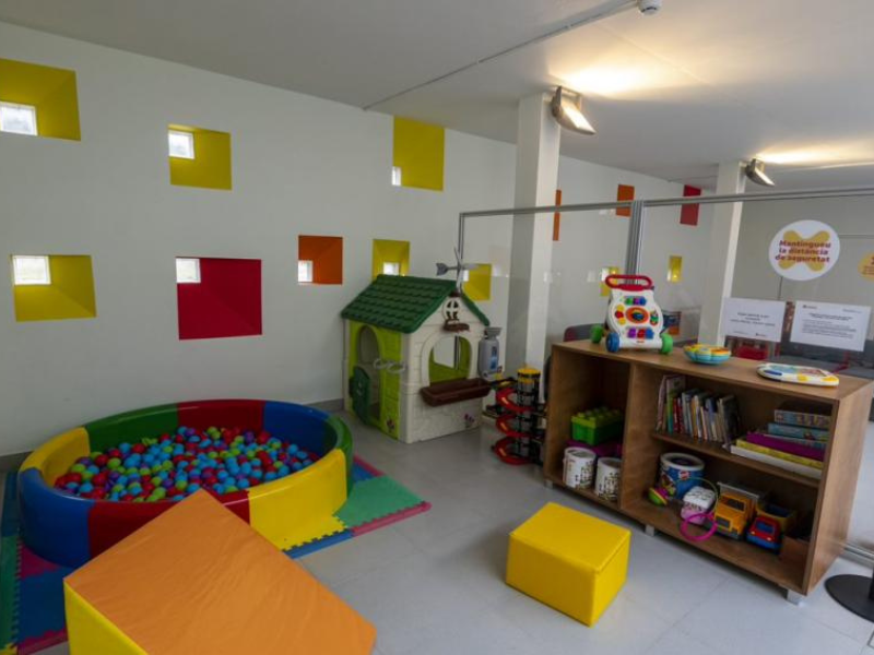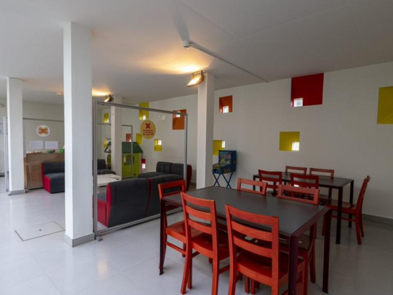Zona de juegos infantiles con terraza y jardín, parking, baños comunes.